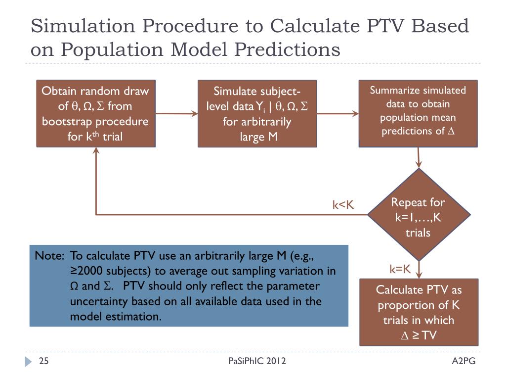 Simulation Procedure to Calculate PTV Based on Population Model Predictions Obtain random draw of , Ω, from bootstrap procedure for kth trial Simulate subject-level data Yi | , Ω, for arbitrarily large M Summarize simulated data to obtain population mean predictions of Calculate PTV as proportion of K trials in which ≥ TV k<K Repeat for k=1,…,K trials Note: To calculate PTV use anarbitrarily large M (e.g., ≥2000 subjects) to average out sampling variation in Ω and . PTV should only reflect the parameter uncertainty based on all available data used in the model estimation. k=K PaSiPhIC 2012
