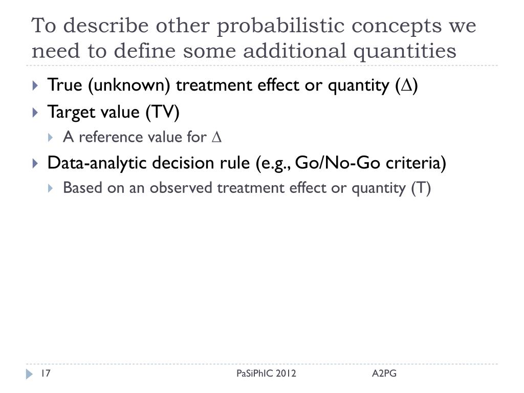 To describe other probabilistic concepts we need to define some additional quantities • True (unknown) treatment effect or quantity () • Target value (TV) • A reference value for • Data-analytic decision rule (e.g., Go/No-Go criteria) • Based on an observed treatment effect or quantity (T) PaSiPhIC 2012