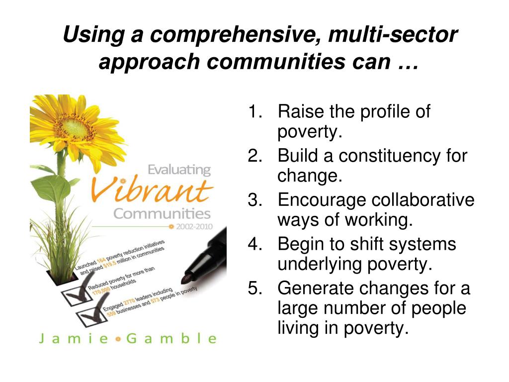 Using a comprehensive, multi-sectorapproach communities can … • Raise the profile of poverty. • Build a constituency for change. • Encourage collaborative ways of working. • Begin to shift systems underlying poverty. • Generate changes for a large number of people living in poverty.
