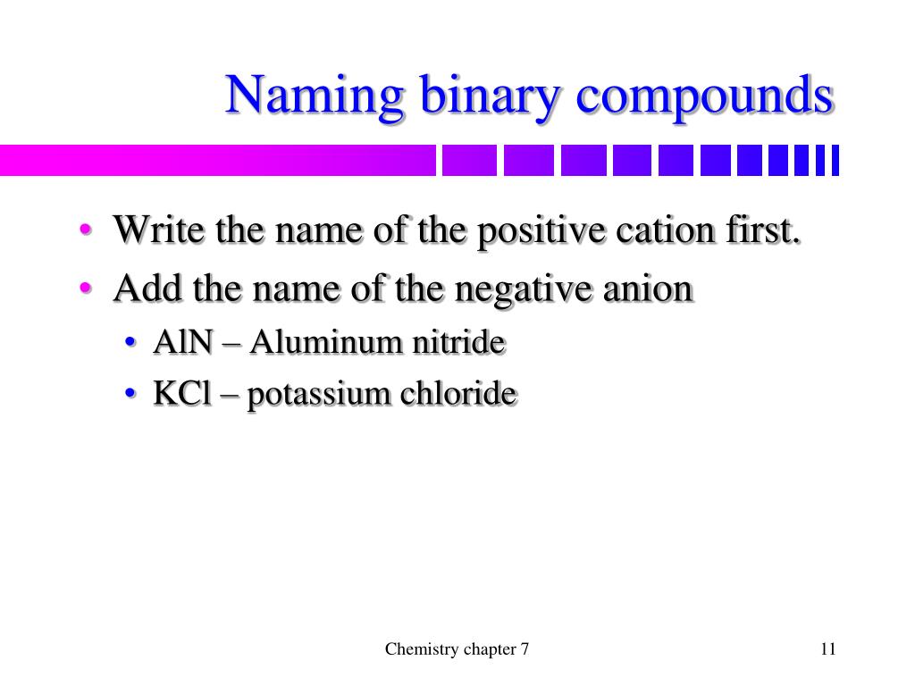 Naming binary compounds • Write the name of the positive cation first. • Add the name of the negative anion • AlN – Aluminum nitride • KCl – potassium chloride Chemistry chapter 7