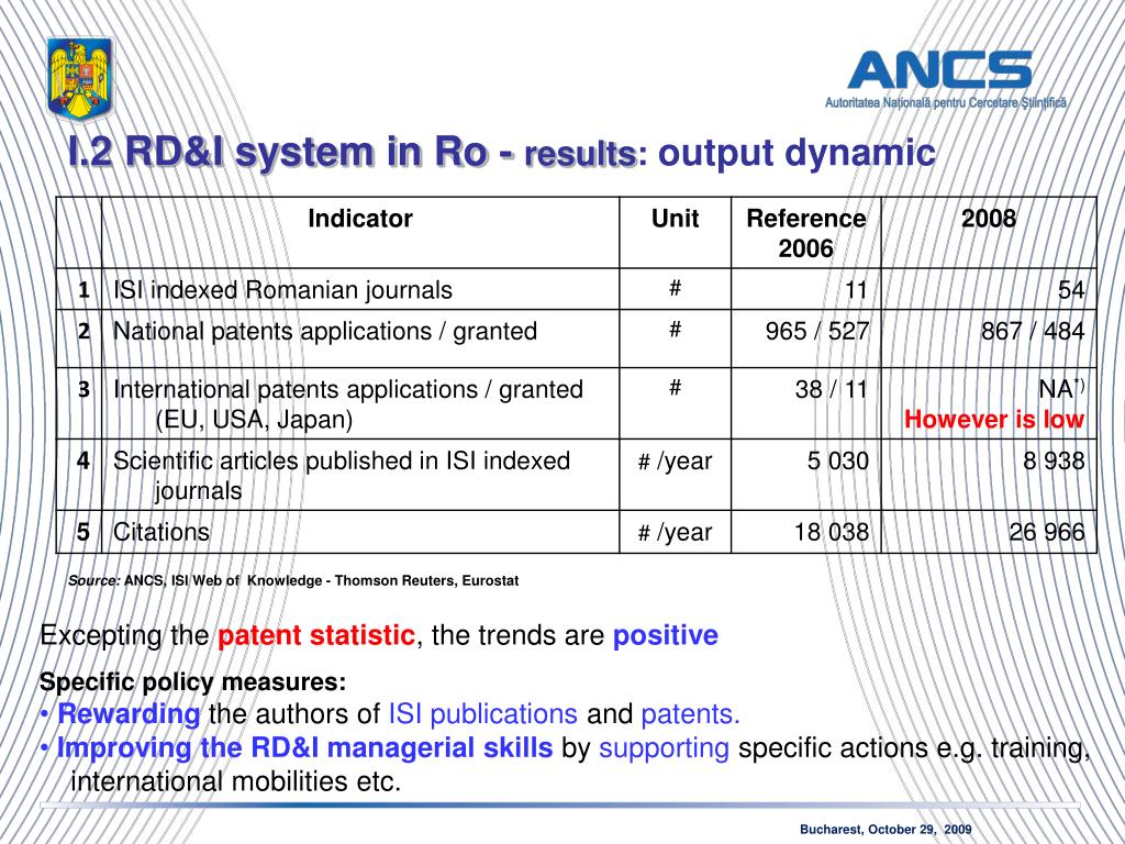 I.2 RD&I system in Ro - results: output dynamic Source: ANCS, ISI Web of Knowledge - Thomson Reuters, Eurostat • Excepting the patent statistic, the trends are positive • Specific policy measures: • Rewarding the authors of ISI publications and patents. • Improving the RD&I managerial skillsby supporting specific actions e.g. training, • international mobilities etc. Bucharest, October 29, 2009
