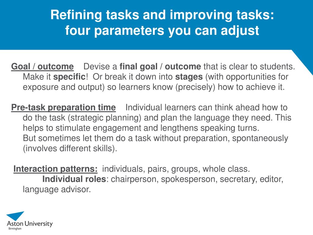 Refining tasks and improving tasks:four parameters you can adjust Goal / outcomeDevise a final goal/ outcome that is clear to students. Make it specific! Or break it down into stages (with opportunities for exposure and output) so learners know (precisely) how to achieve it. Pre-task preparation timeIndividual learners can think ahead how to do the task (strategic planning) and plan the language they need. This helps to stimulate engagement and lengthens speaking turns. But sometimes let them do a task without preparation, spontaneously (involves different skills). Interaction patterns: individuals, pairs, groups, whole class. Individual roles: chairperson, spokesperson, secretary, editor, language advisor.