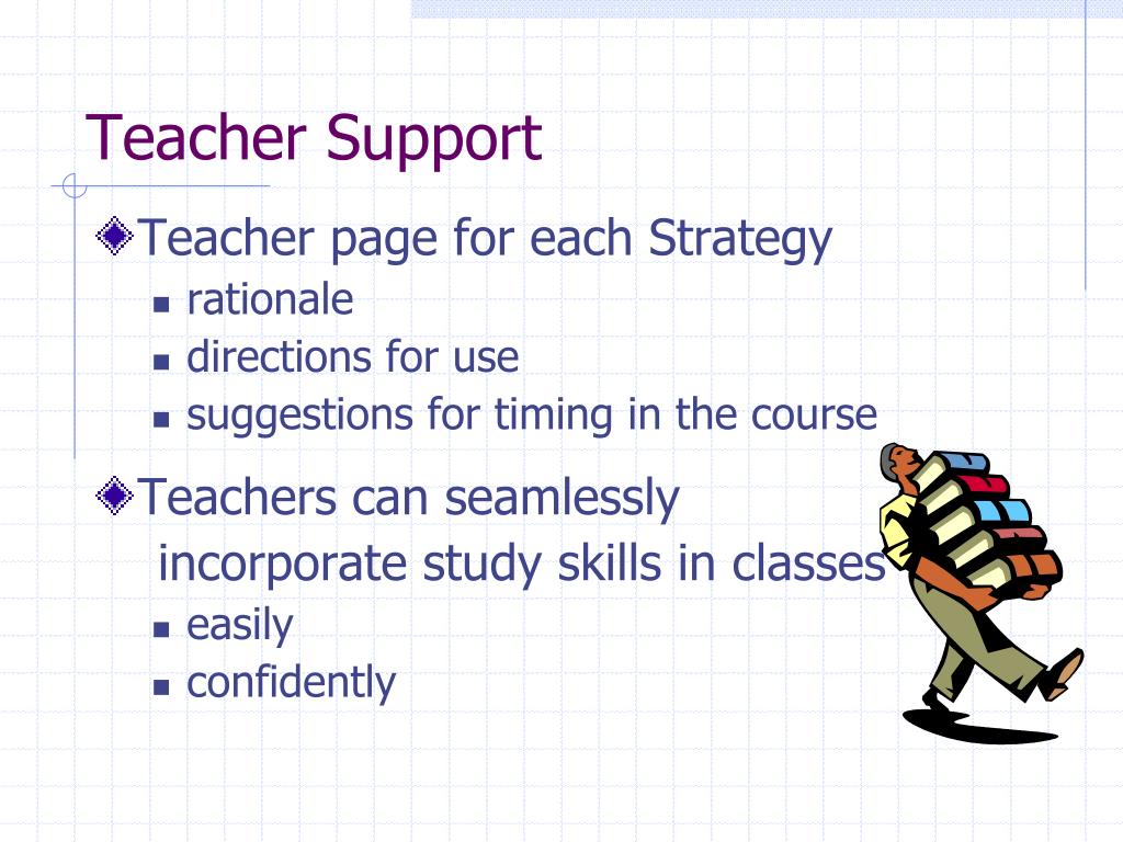 Teacher Support • Teacher page for each Strategy • rationale • directions for use • suggestions for timing in the course • Teachers can seamlessly incorporate study skills in classes • easily • confidently