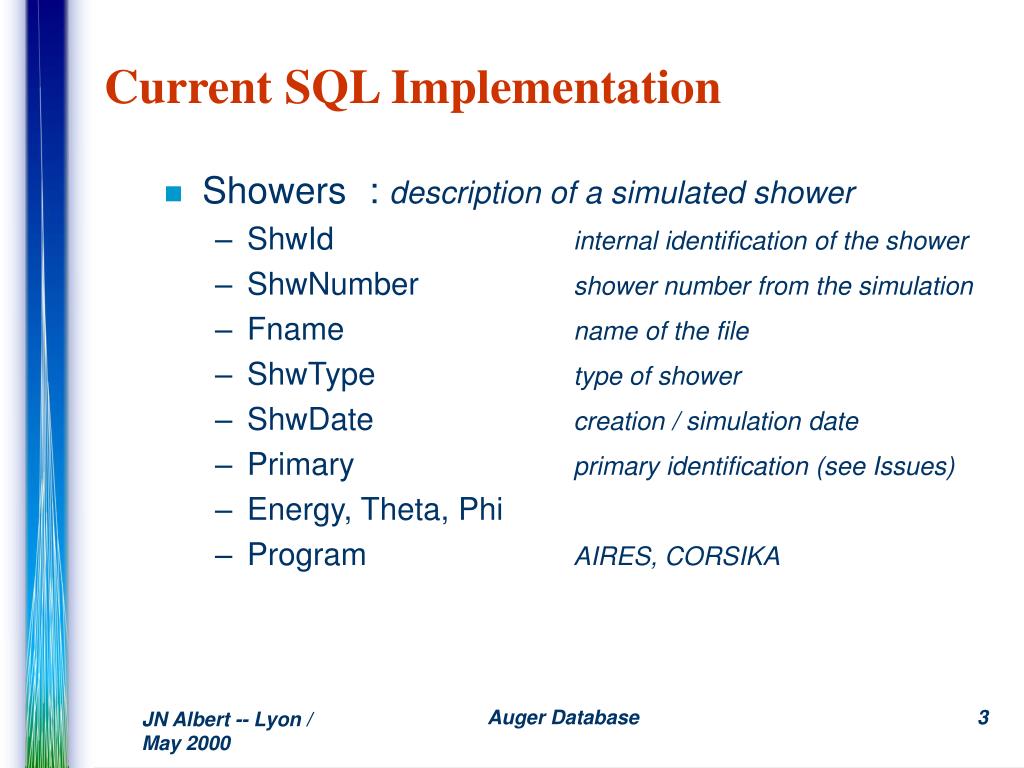 Auger Showers Catalog. ( Auger Database) Jean-Noël Albert - LAL - May 2000. Shower Header. Producer. Simulation. Real Shower. Run. Simulated Shower. Corsika. Aires. Simplified Model. Current SQL Implementation. Showers : description of a simulated shower