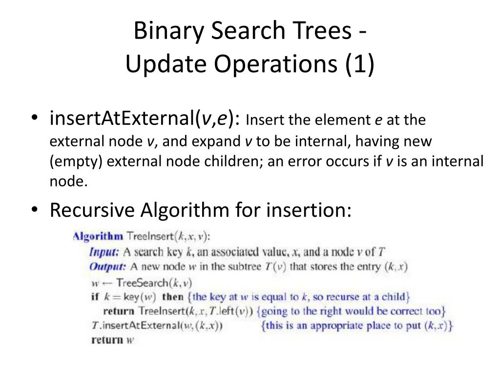 Binary Search Trees -Update Operations (1) • insertAtExternal(v,e): Insert the element e at the external node v, and expand v to be internal, having new (empty) external node children; an error occurs if v is an internal node. • Recursive Algorithm for insertion: