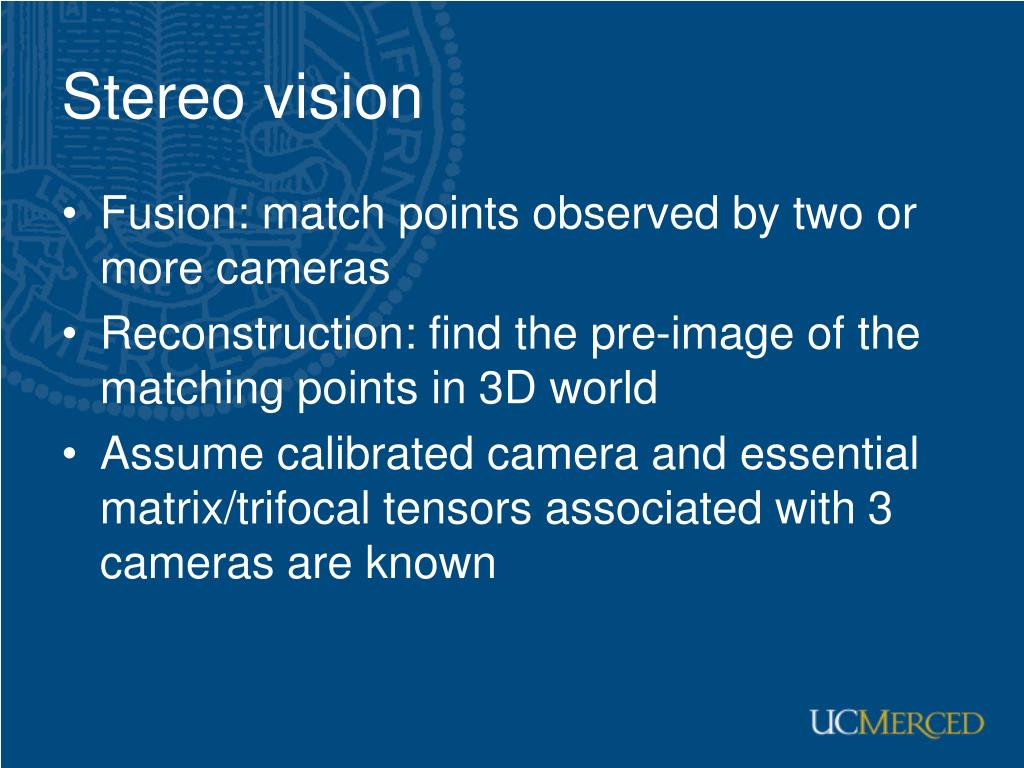 Stereo vision • Fusion: match points observed by two or more cameras • Reconstruction: find the pre-image of the matching points in 3D world • Assume calibrated camera and essential matrix/trifocal tensors associated with 3 cameras are known