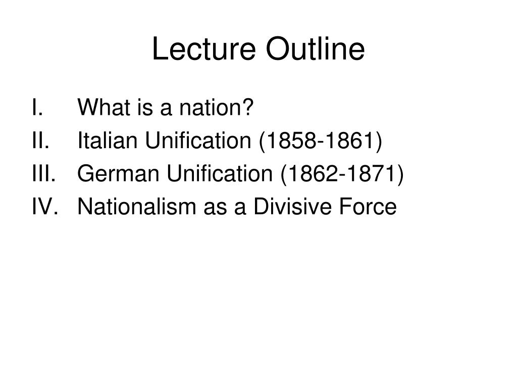 Lecture Outline • What is a nation? • Italian Unification (1858-1861) • German Unification (1862-1871) • Nationalism as a Divisive Force