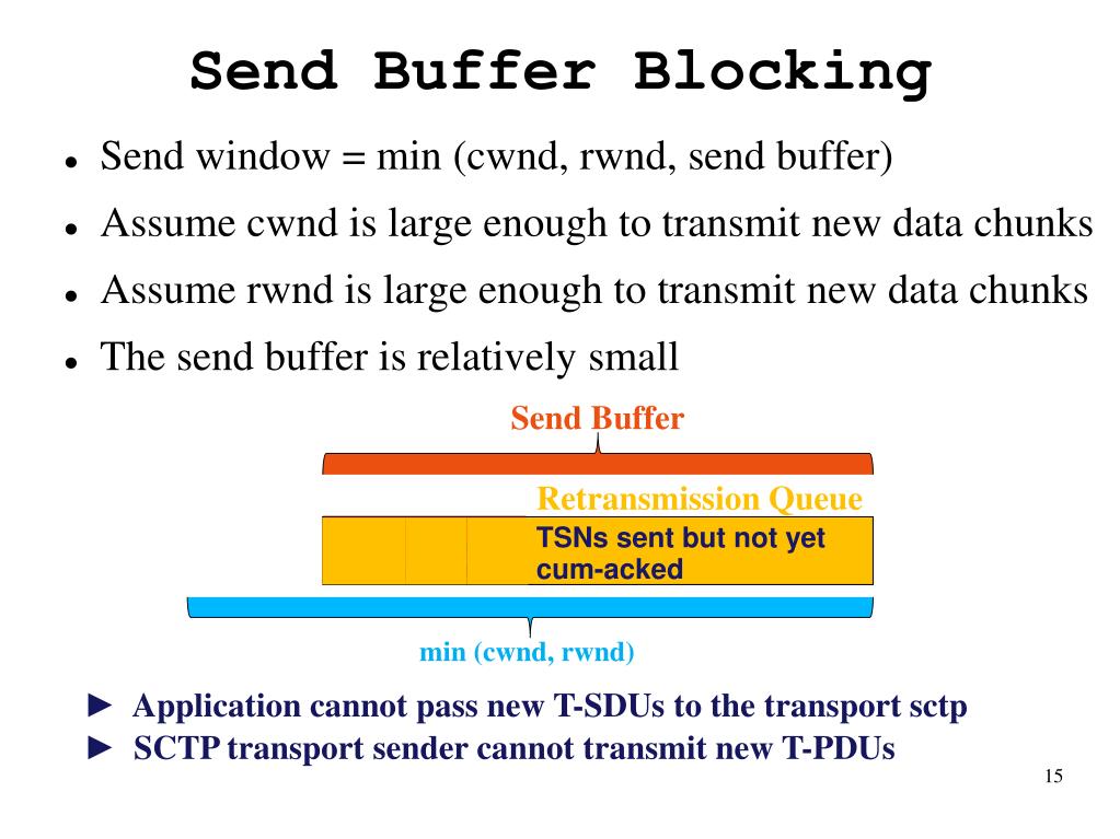 Send Buffer Blocking • Send window = min (cwnd, rwnd, send buffer) • Assume cwnd is large enough to transmit new data chunks • Assume rwnd is large enough to transmit new data chunks • The send buffer is relatively small Send Buffer Retransmission Queue TSNs sent but not yet cum-acked TSNs not yet transmitted ► Application cannot pass new T-SDUs to the transport sctp ► SCTP transport sender cannot transmit new T-PDUs min (cwnd, rwnd)