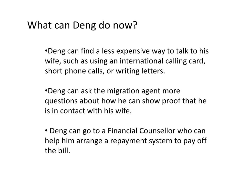 What can Deng do now? • Deng can find a less expensive way to talk to his wife, such as using an international calling card, short phone calls, or writing letters. • Deng can ask the migration agent more questions about how he can show proof that he is in contact with his wife. • Deng can go to a Financial Counsellor who can help him arrange a repayment system to pay off the bill.