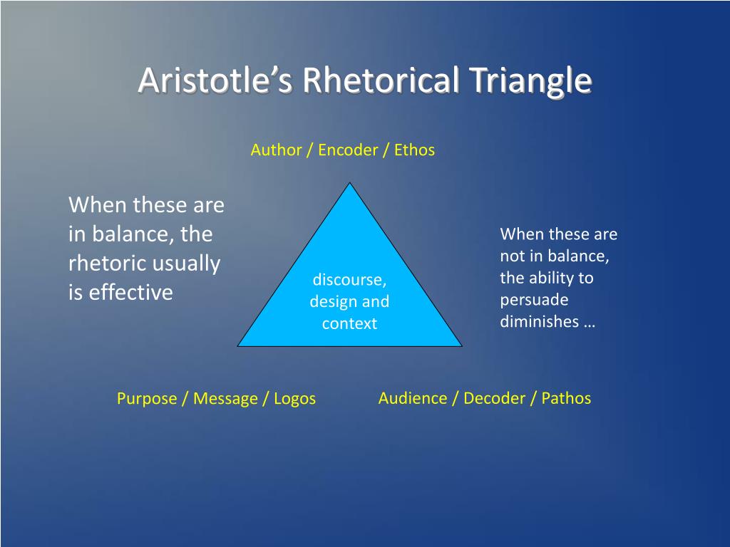 Aristotle’s Rhetorical Triangle Author / Encoder / Ethos discourse, design and context When these are in balance, the rhetoric usually is effective When these are not in balance, the ability to persuade diminishes … Audience / Decoder / Pathos Purpose / Message / Logos