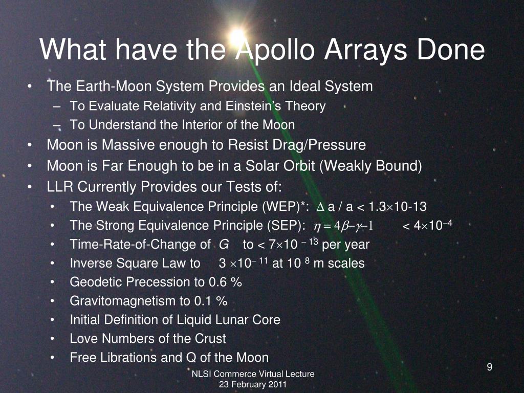 What have the Apollo Arrays Done • The Earth-Moon System Provides an Ideal System • To Evaluate Relativity and Einstein’s Theory • To Understand the Interior of the Moon • Moon is Massive enough to Resist Drag/Pressure • Moon is Far Enough to be in a Solar Orbit (Weakly Bound) • LLR Currently Provides our Tests of: • The Weak Equivalence Principle (WEP)*: a / a < 1.310-13 • The Strong Equivalence Principle (SEP): < 4104 • Time-Rate-of-Change of G to < 710 13 per year • Inverse Square Law to 3 10 11 at 10 8 m scales • Geodetic Precession to 0.6 % • Gravitomagnetism to 0.1 % • Initial Definition of Liquid Lunar Core • Love Numbers of the Crust • Free Librations and Q of the Moon NLSI Commerce Virtual Lecture 23 February 2011