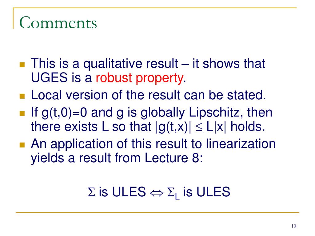 Comments • This is a qualitative result – it shows that UGES is a robust property. • Local version of the result can be stated. • If g(t,0)=0 and g is globally Lipschitz, then there exists L so that |g(t,x)| L|x| holds. • An application of this result to linearization yields a result from Lecture 8: is ULES L is ULES
