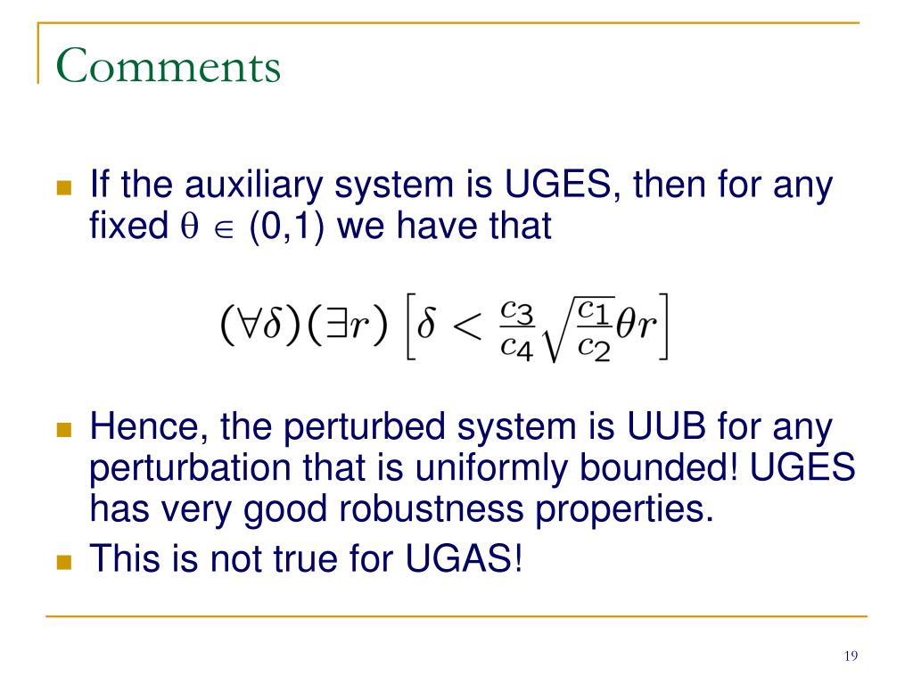 Comments • If the auxiliary system is UGES, then for any fixed (0,1) we have that • Hence, the perturbed system is UUB for any perturbation that is uniformly bounded! UGES has very good robustness properties. • This is not true for UGAS!