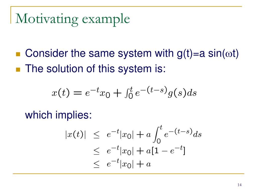 Motivating example • Consider the same system with g(t)=a sin(t) • The solution of this system is: which implies: