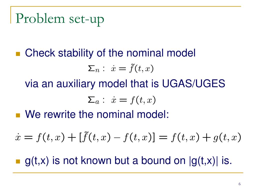 Problem set-up • Check stability of the nominal model via an auxiliary model that is UGAS/UGES • We rewrite the nominal model: • g(t,x) is not known but a bound on |g(t,x)| is.