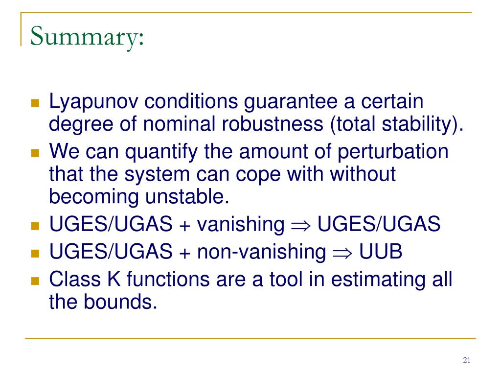 Summary: • Lyapunov conditions guarantee a certain degree of nominal robustness (total stability). • We can quantify the amount of perturbation that the system can cope with without becoming unstable. • UGES/UGAS + vanishing UGES/UGAS • UGES/UGAS + non-vanishing UUB • Class K functions are a tool in estimating all the bounds.