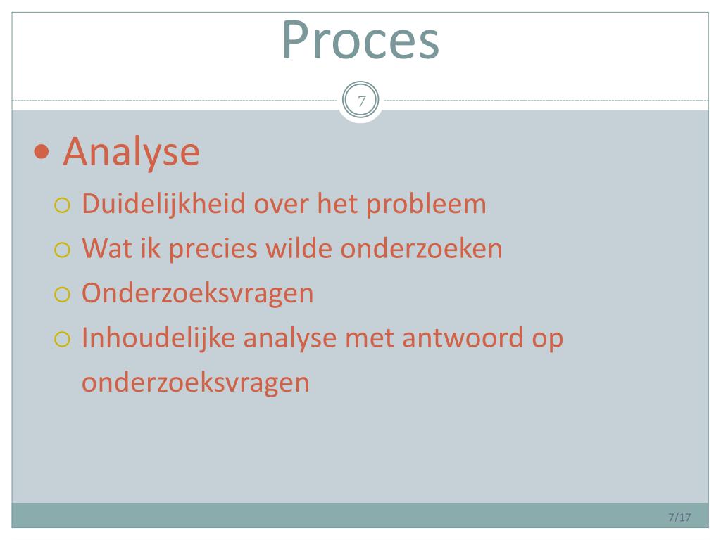 Proces • Analyse • Duidelijkheid over het probleem • Wat ik precies wilde onderzoeken • Onderzoeksvragen • Inhoudelijke analyse met antwoord op onderzoeksvragen 7/17