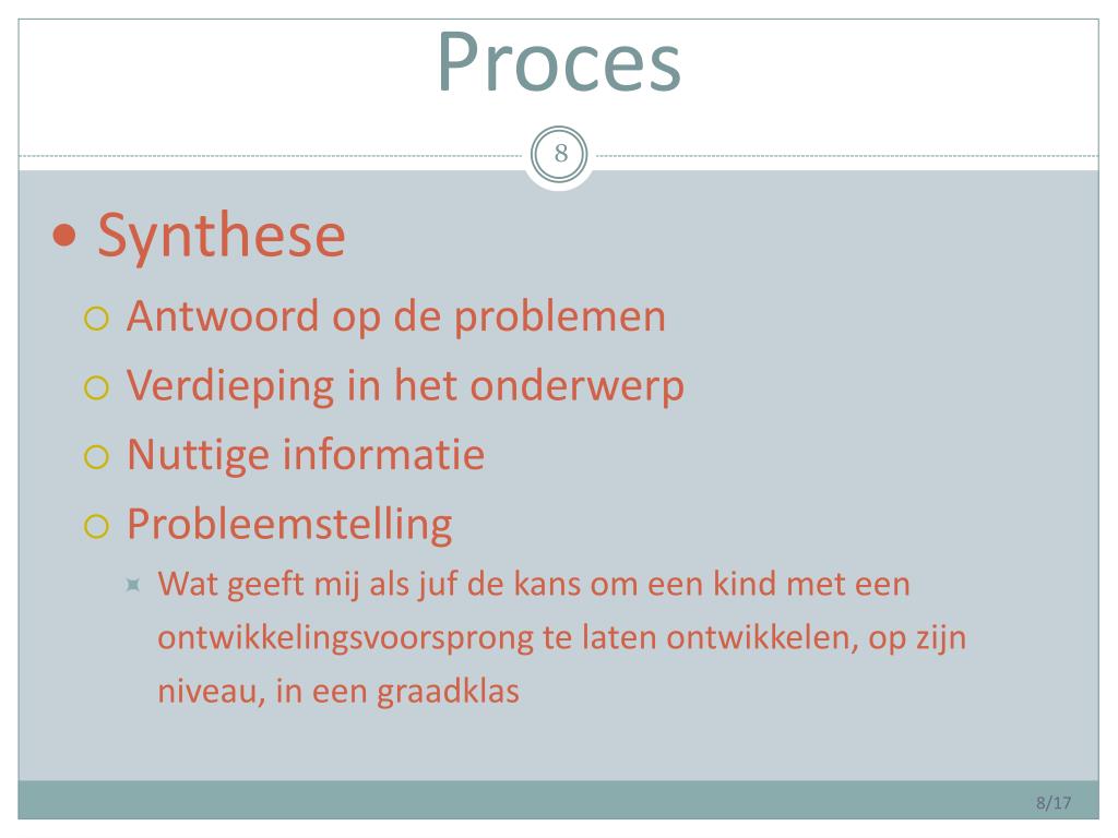 Proces • Synthese • Antwoord op de problemen • Verdieping in het onderwerp • Nuttige informatie • Probleemstelling • Wat geeft mij als juf de kans om een kind met een ontwikkelingsvoorsprong te laten ontwikkelen, op zijn niveau, in een graadklas 8/17