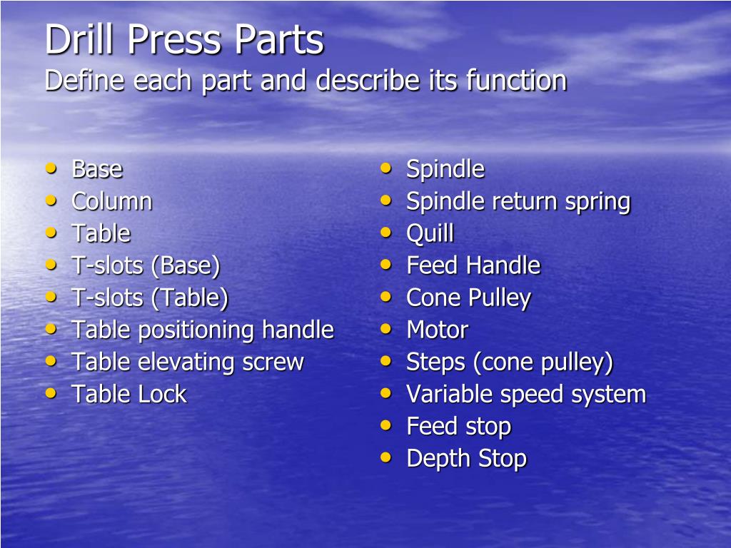 Base Column Table T-slots (Base) T-slots (Table) Table positioning handle Table elevating screw Table Lock Spindle Spindle return spring Quill Feed Handle Cone Pulley Motor Steps (cone pulley) Variable speed system Feed stop Depth Stop Drill Press PartsDefine each part and describe its function