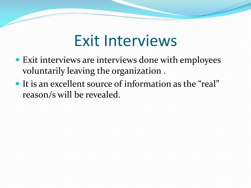 Exit Interviews • Exit interviews are interviews done with employees voluntarily leaving the organization . • It is an excellent source of information as the “real” reason/s will be revealed.