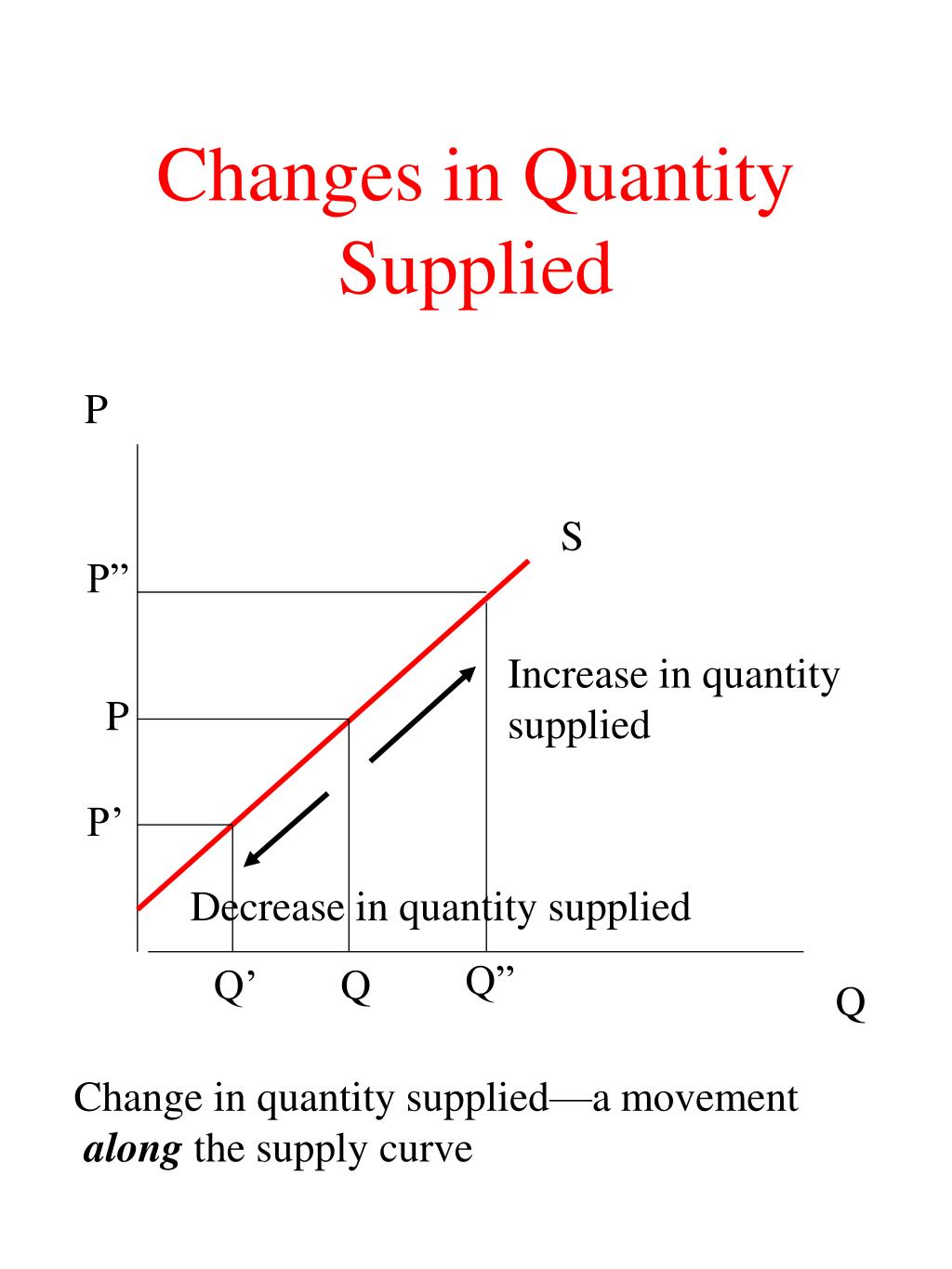 Changes in Quantity Supplied P S P” Increase in quantity supplied P P’ Decrease in quantity supplied Q” Q’ Q Q Change in quantity supplied—a movement alongthe supply curve