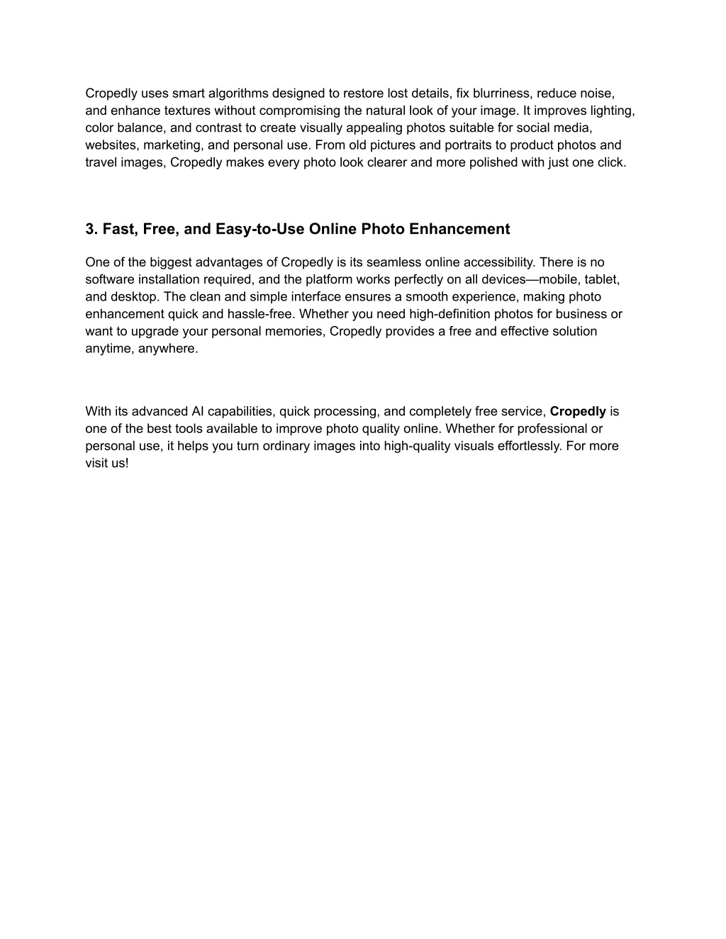 2. Cropedly uses smart algorithms designed to restore lost details, fix blurriness, reduce noise, and enhance textures without compromising the natural look of your image. It improves lighting, color balance, and contrast to create visually appealing photos suitable for social media, websites, marketing, and personal use. From old pictures and portraits to product photos and travel images, Cropedly makes every photo look clearer and more polished with just one click. 3. Fast, Free, and Easy-to-Use Online Photo Enhancement One of the biggest advantages of Cropedly is its seamless online accessibility. There is no software installation required, and the platform works perfectly on all devices—mobile, tablet, and desktop. The clean and simple interface ensures a smooth experience, making photo enhancement quick and hassle-free. Whether you need high-definition photos for business or want to upgrade your personal memories, Cropedly provides a free and effective solution anytime, anywhere. With its advanced AI capabilities, quick processing, and completely free service, Cropedly is one of the best tools available to improve photo quality online. Whether for professional or personal use, it helps you turn ordinary images into high-quality visuals effortlessly. For more visit us!