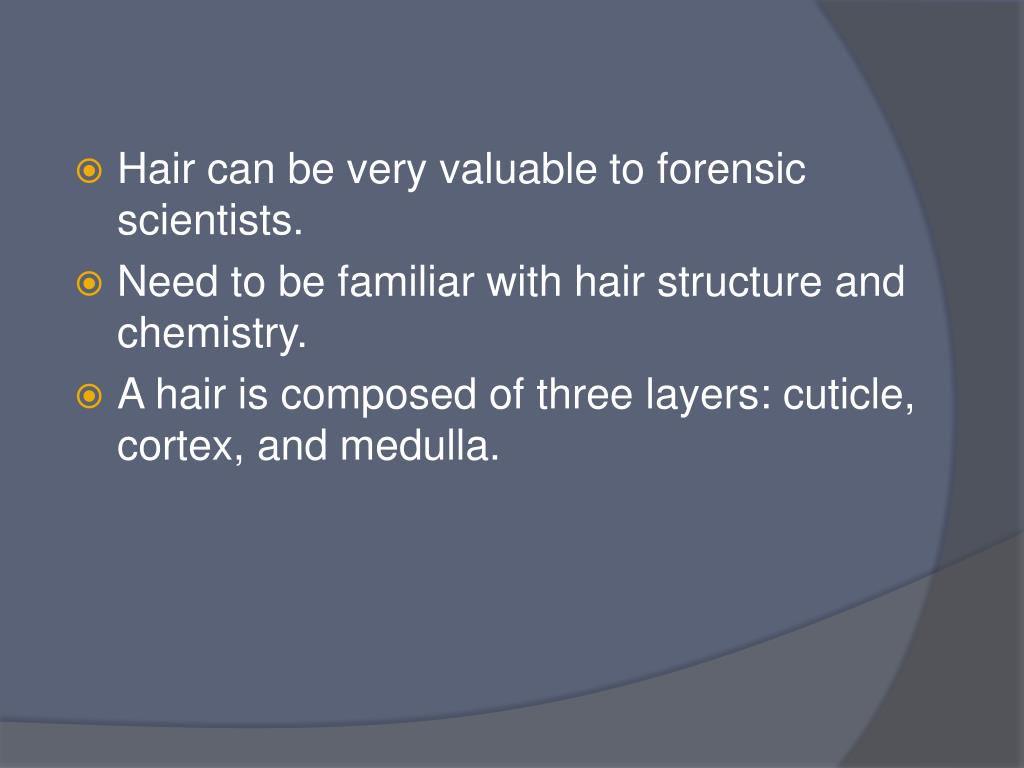 Hair can be very valuable to forensic scientists. • Need to be familiar with hair structure and chemistry. • A hair is composed of three layers: cuticle, cortex, and medulla.