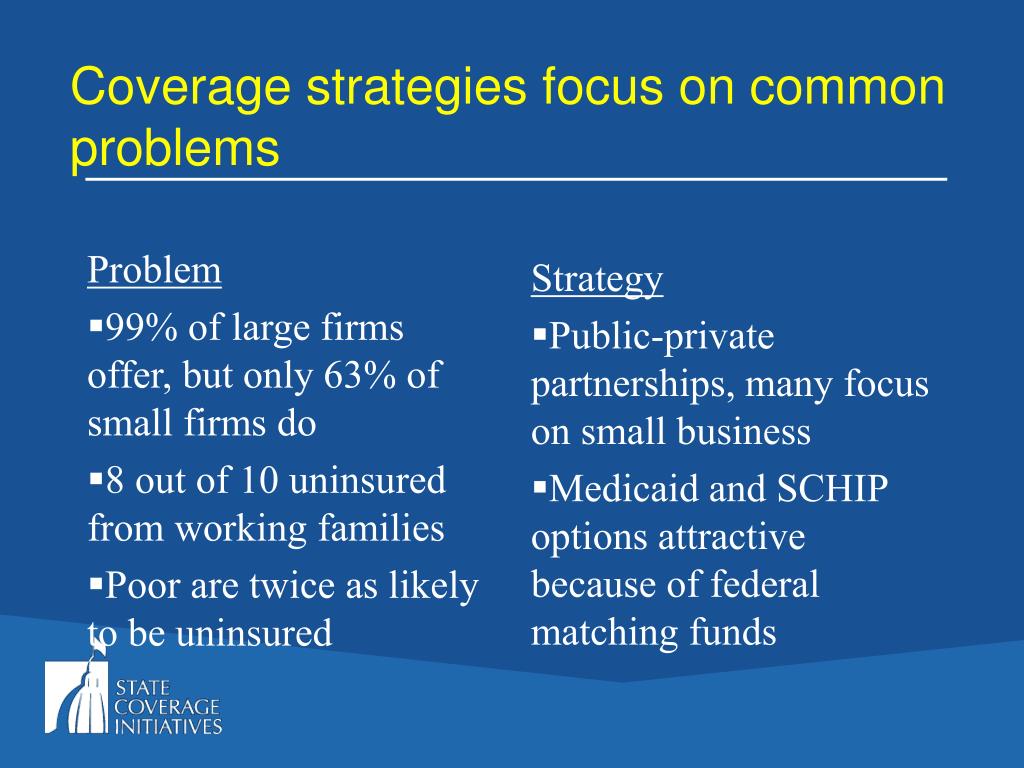 Problem 99% of large firms offer, but only 63% of small firms do 8 out of 10 uninsured from working families Poor are twice as likely to be uninsured Strategy Public-private partnerships, many focus on small business Medicaid and SCHIP options attractive because of federal matching funds Coverage strategies focus on common problems