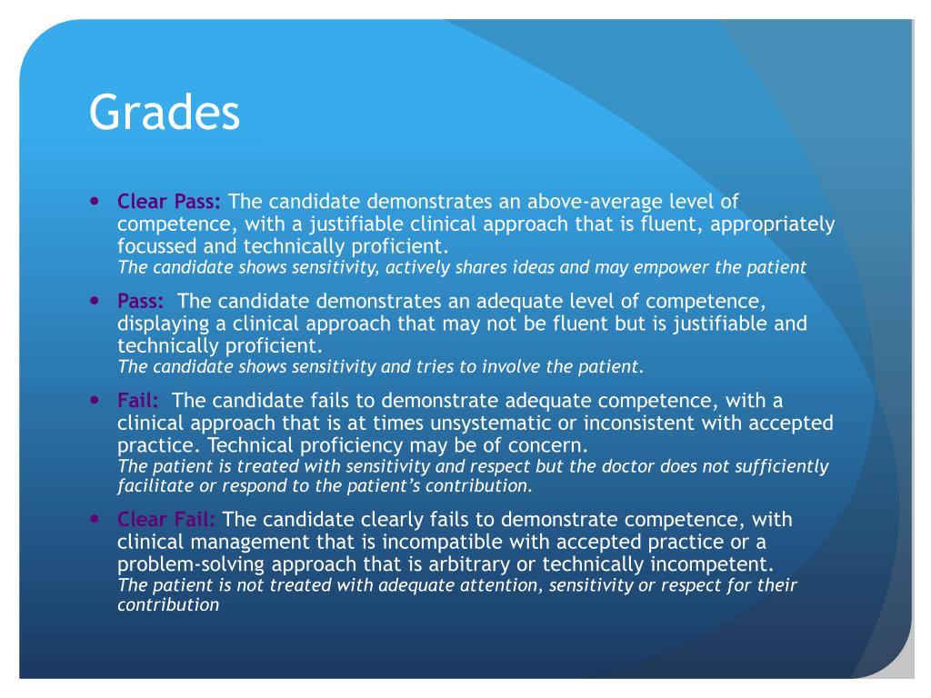 Grades • Clear Pass: The candidate demonstrates an above-average level of competence, with a justifiable clinical approach that is fluent, appropriately focussed and technically proficient. The candidate shows sensitivity, actively shares ideas and may empower the patient • Pass: The candidate demonstrates an adequate level of competence, displaying a clinical approach that may not be fluent but is justifiable and technically proficient. The candidate shows sensitivity and tries to involve the patient. • Fail: The candidate fails to demonstrate adequate competence, with a clinical approach that is at times unsystematic or inconsistent with accepted practice. Technical proficiency may be of concern. The patient is treated with sensitivity and respect but the doctor does not sufficiently facilitate or respond to the patient’s contribution. • Clear Fail:The candidate clearly fails to demonstrate competence, with clinical management that is incompatible with accepted practice or a problem-solving approach that is arbitrary or technically incompetent. The patient is not treated with adequate attention, sensitivity or respect for their contribution