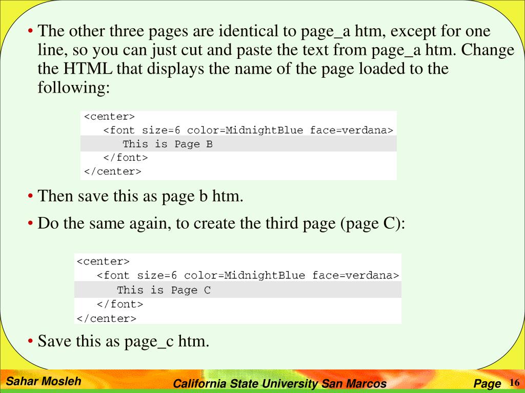 The other three pages are identical to page_a htm, except for one line, so you can just cut and paste the text from page_a htm. Change the HTML that displays the name of the page loaded to the following: • Then save this as page b htm. • Do the same again, to create the third page (page C): • Save this as page_c htm.