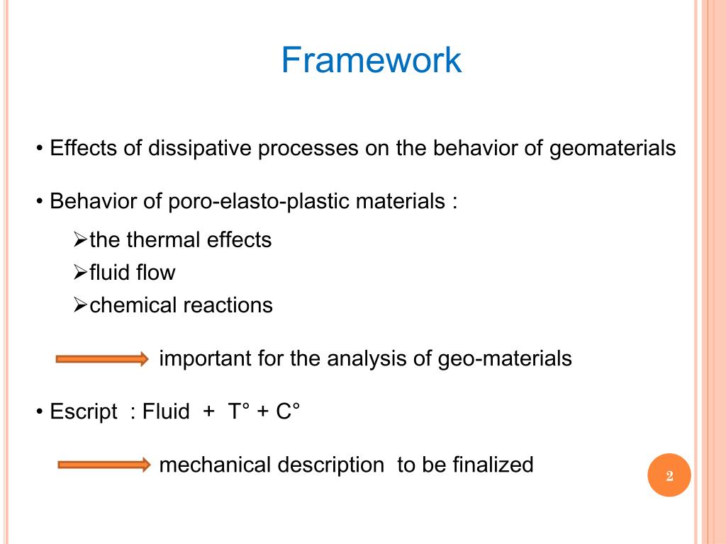 Framework • Effects of dissipative processes on the behavior of geomaterials • Behavior of poro-elasto-plastic materials : • the thermal effects • fluid flow • chemical reactions • important for the analysis of geo-materials • Escript : Fluid + T° + C° • mechanical description to be finalized