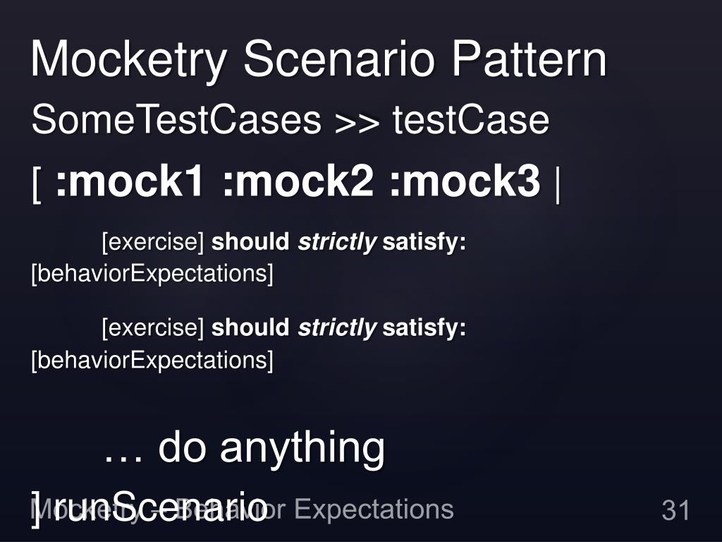 Mocketry Scenario Pattern SomeTestCases >> testCase [ [exercise] should strictly satisfy: [behaviorExpectations] [exercise] should strictly satisfy: [behaviorExpectations] … do anything ] runScenario Mocketry – Behavior Expectations