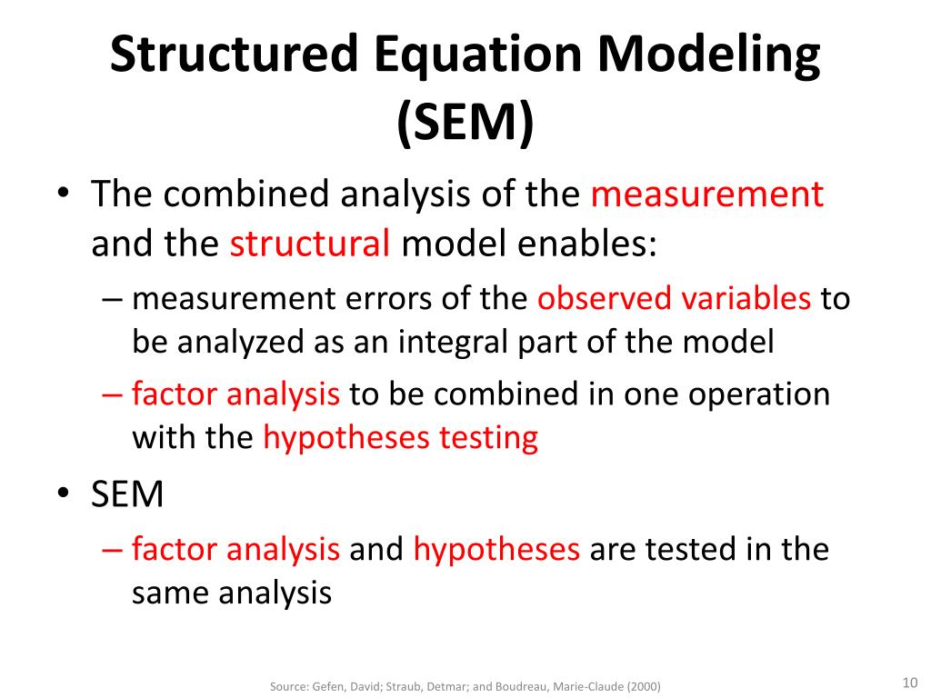 Structured Equation Modeling (SEM) • The combined analysis of the measurement and the structural model enables: • measurement errors of the observed variables to be analyzed as an integral part of the model • factor analysis to be combined in one operation with the hypotheses testing • SEM • factor analysis and hypotheses are tested in the same analysis Source: Gefen, David; Straub, Detmar; and Boudreau, Marie-Claude (2000)