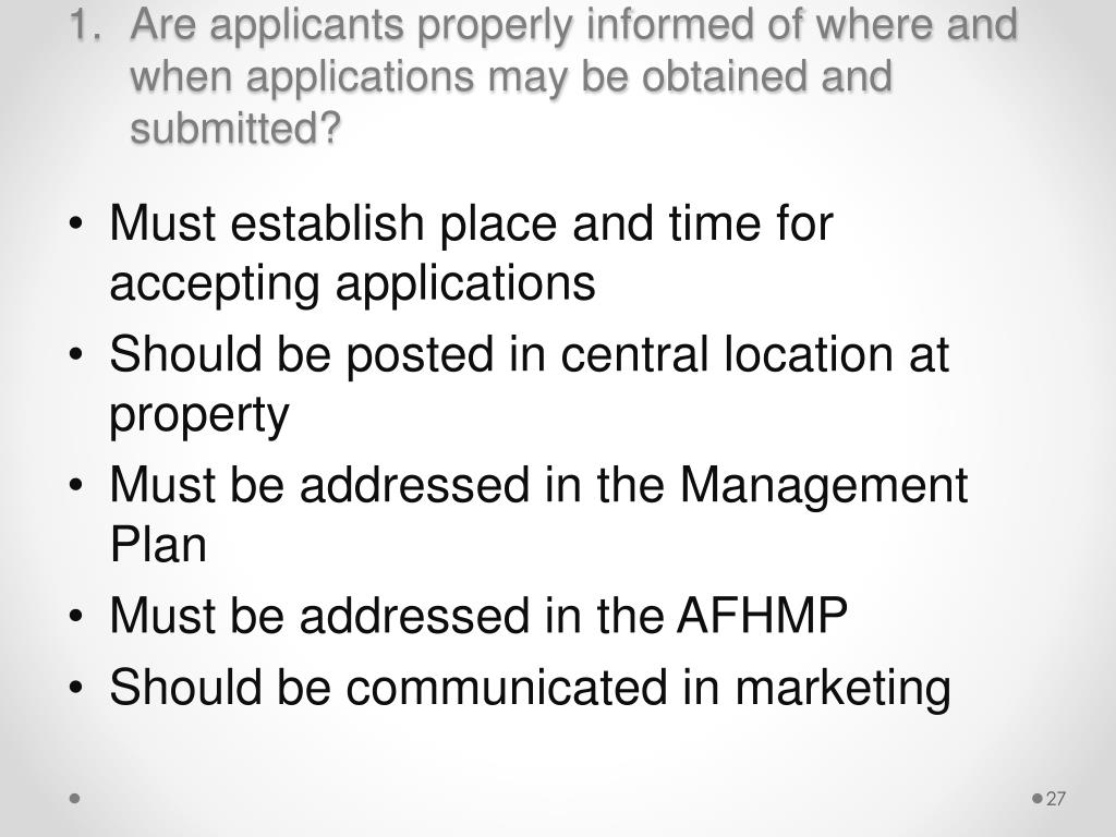 Are applicants properly informed of where and when applications may be obtained and submitted? • Must establish place and time for accepting applications • Should be posted in central location at property • Must be addressed in the Management Plan • Must be addressed in the AFHMP • Should be communicated in marketing