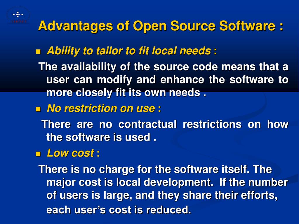 Advantages of Open Source Software : Ability to tailor to fit local needs : The availability of the source code means that a user can modify and enhance the software to more closely fit its own needs . No restriction on use : There are no contractual restrictions on how the software is used . Low cost : There is no charge for the software itself. The major cost is local development. If the number of users is large, and they share their efforts, each user’s cost is reduced.