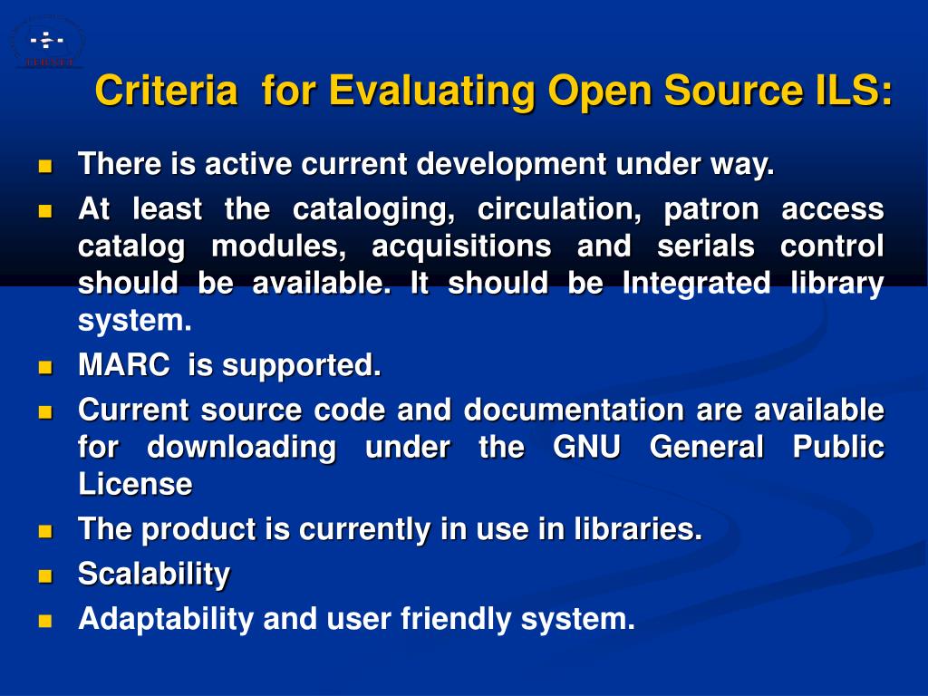 Criteria for Evaluating Open Source ILS: There is active current development under way. At least the cataloging, circulation, patron access catalog modules, acquisitions and serials control should be available. It should be Integrated library system. MARC is supported. Current source code and documentation are available for downloading under the GNU General Public License The product is currently in use in libraries. Scalability Adaptability and user friendly system.