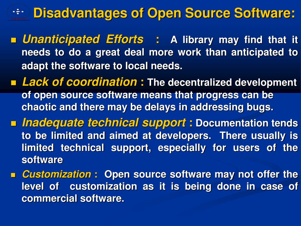 Disadvantages of Open Source Software: Unanticipated Efforts : A library may find that it needs to do a great deal more work than anticipated to adapt the software to local needs. Lack of coordination :The decentralized development of open source software means that progress can be chaotic and there may be delays in addressing bugs. Inadequate technical support : Documentation tends to be limited and aimed at developers. There usually is limited technical support, especially for users of the software Customization : Open source software may not offer the level of customization as it is being done in case of commercial software.