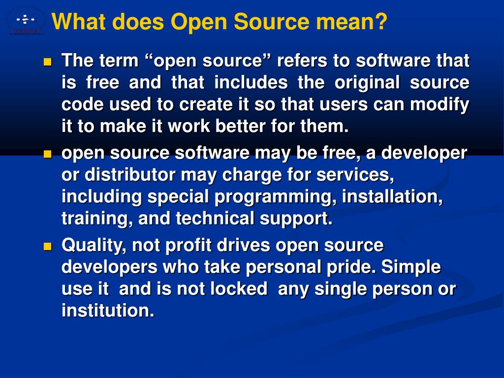 What does Open Source mean? The term “open source” refers to software that is free and that includes the original source code used to create it so that users can modify it to make it work better for them. open source software may be free, a developer or distributor may charge for services, including special programming, installation, training, and technical support. Quality, not profit drives open source developers who take personal pride. Simple use it and is not locked any single person or institution.