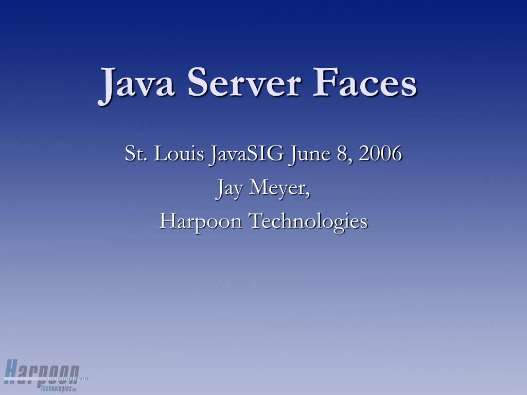 Java Server Faces. St. Louis JavaSIG June 8, 2006 Jay Meyer, Harpoon Technologies. About Me. Master CS from Washington Univ. (wustl.edu) Software developer for 14 years (1992) Java Web development since 1999 Certified JBoss Application Developer