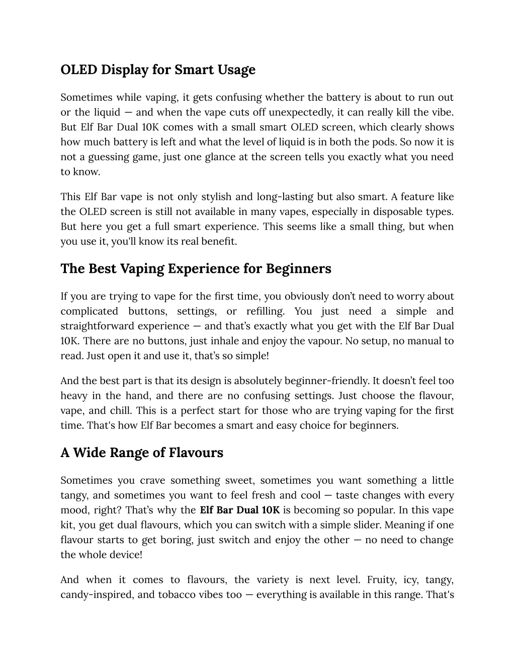 OLED Display for Smart Usage Sometimes while vaping, it gets confusing whether the battery is about to run out or the liquid — and when the vape cuts off unexpectedly, it can really kill the vibe. But Elf Bar Dual 10K comes with a small smart OLED screen, which clearly shows how much battery is left and what the level of liquid is in both the pods. So now it is not a guessing game, just one glance at the screen tells you exactly what you need to know. This Elf Bar vape is not only stylish and long-lasting but also smart. A feature like the OLED screen is still not available in many vapes, especially in disposable types. But here you get a full smart experience. This seems like a small thing, but when you use it, you'll know its real benefit. The Best Vaping Experience for Beginners If you are trying to vape for the first time, you obviously don’t need to worry about complicated buttons, settings, or refilling. You just need a simple and straightforward experience — and that’s exactly what you get with the Elf Bar Dual 10K. There are no buttons, just inhale and enjoy the vapour. No setup, no manual to read. Just open it and use it, that’s so simple! And the best part is that its design is absolutely beginner-friendly. It doesn’t feel too heavy in the hand, and there are no confusing settings. Just choose the flavour, vape, and chill. This is a perfect start for those who are trying vaping for the first time. That's how Elf Bar becomes a smart and easy choice for beginners. A Wide Range of Flavours Sometimes you crave something sweet, sometimes you want something a little tangy, and sometimes you want to feel fresh and cool — taste changes with every mood, right? That’s why the Elf Bar Dual 10K is becoming so popular. In this vape kit, you get dual flavours, which you can switch with a simple slider. Meaning if one flavour starts to get boring, just switch and enjoy the other — no need to change the whole device! And when it comes to flavours, the variety is next level. Fruity, icy, tangy, candy-inspired, and tobacco vibes too — everything is available in this range. That's