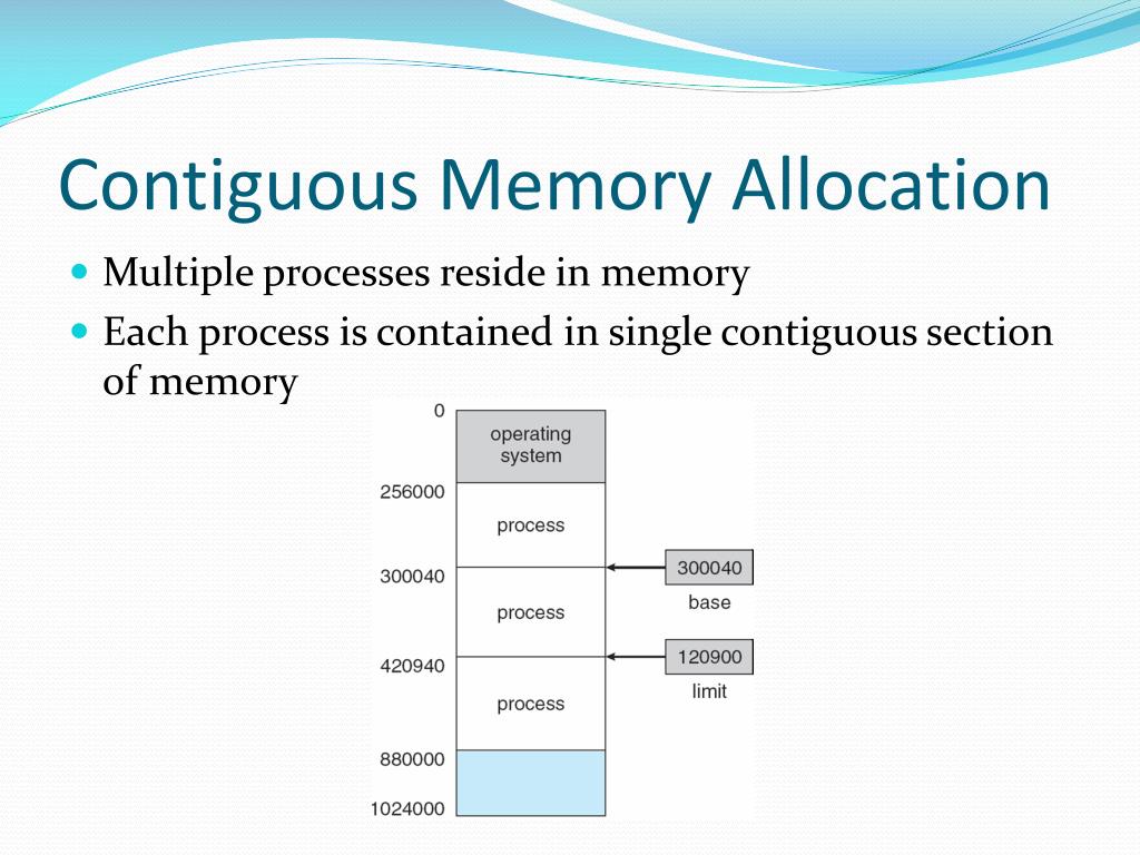 Contiguous Memory Allocation • Multiple processes reside in memory • Each process is contained in single contiguous section of memory