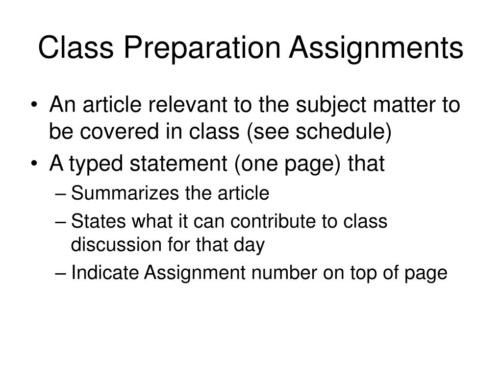 Class Preparation Assignments • An article relevant to the subject matter to be covered in class (see schedule) • A typed statement (one page) that • Summarizes the article • States what it can contribute to class discussion for that day • Indicate Assignment number on top of page