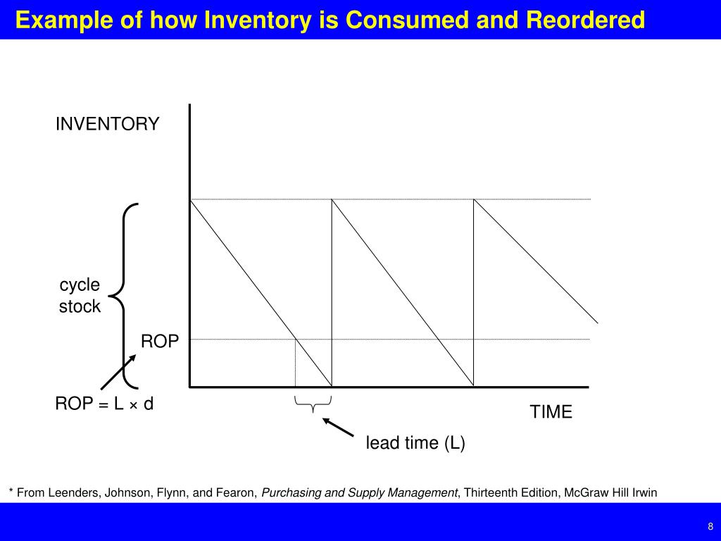 Example of how Inventory is Consumed and Reordered INVENTORY cycle stock ROP ROP = L × d TIME lead time (L) * From Leenders, Johnson, Flynn, and Fearon, Purchasing and Supply Management, Thirteenth Edition, McGraw Hill Irwin