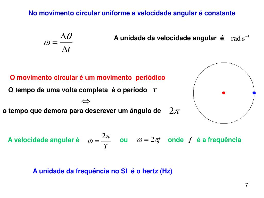 No movimento circular uniforme a velocidade angular é constante A unidade da velocidade angular é O movimento circular é um movimento periódico O tempo de uma volta completa é o período T o tempo que demora para descrever um ângulo de ou onde fé a frequência A velocidade angular é A unidade da frequência no SI é o hertz (Hz) 7