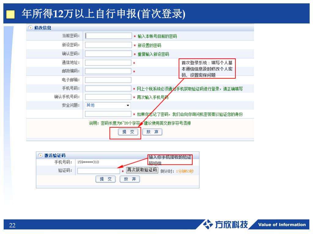 年所得12万以上自行申报 注意事项 • 申报后,需经税务机关在核心系统成功处理申报数据,才转为正式申报。 • 已登记人员首次登录前,请先向代扣代缴单位或所属税务机关领取个人网上密码;纳税人如更改密码后忘记密码,请携带有效身份证明资料到登记机关办理密码重置。 • 重复申报时需要录入全年的申报数据(纳税人的申报表也需要完整填写全年申报数据),因核心不能自动带出已申报数据,所以需要操作人员重新录入申报数据。