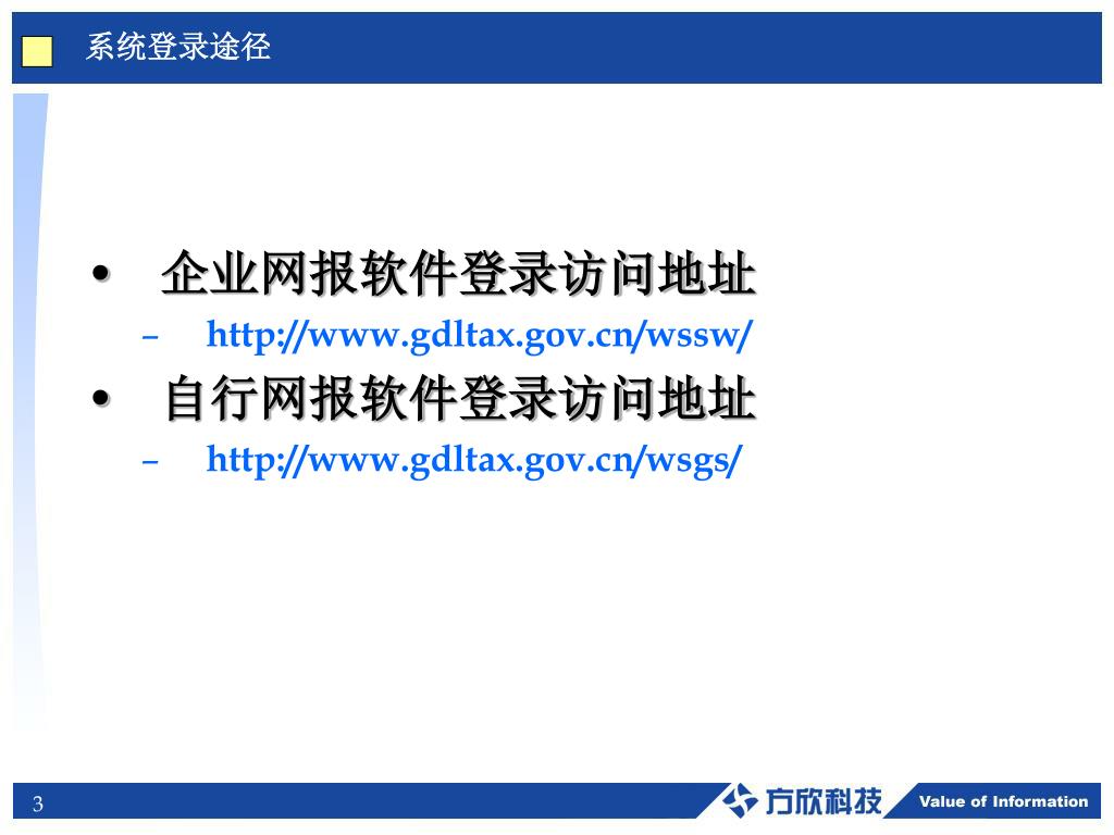 系统登录途径 • 企业网报软件登录访问地址 • http://www.gdltax.gov.cn/wssw/ • 自行网报软件登录访问地址 • http://www.gdltax.gov.cn/wsgs/