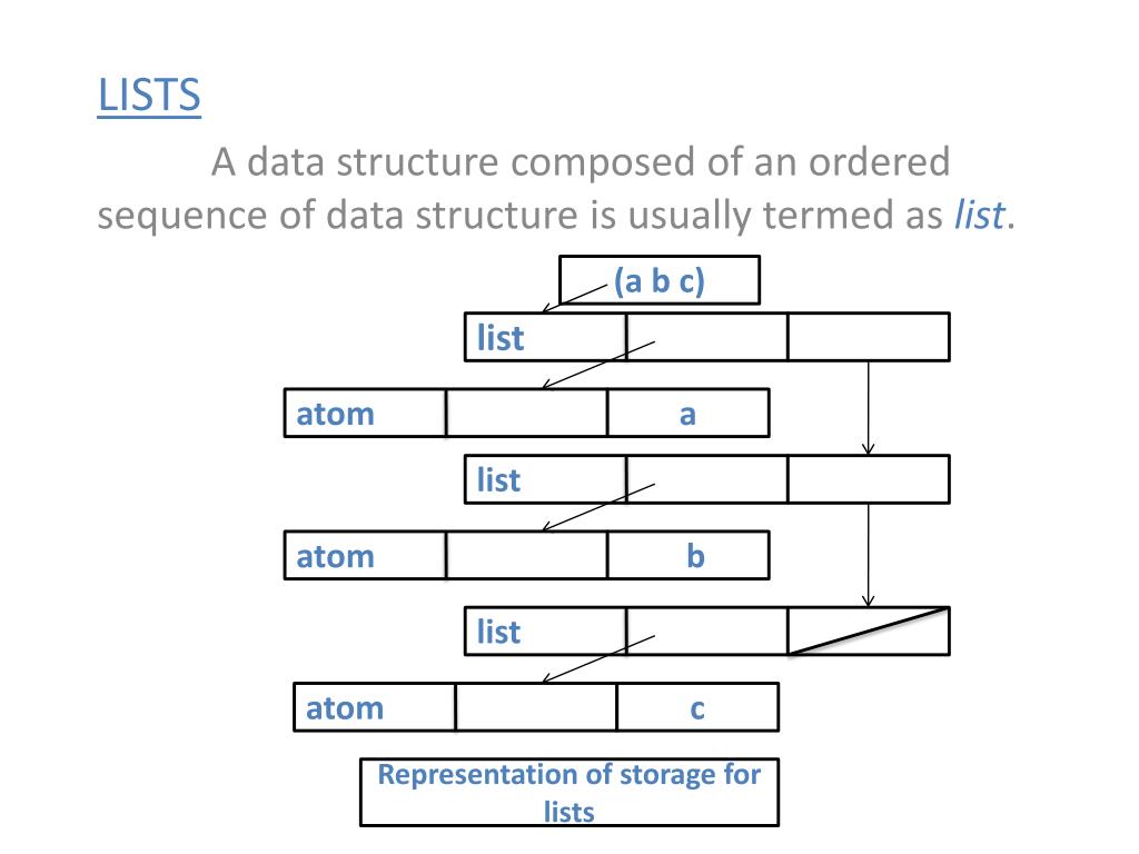 (a b c) list atom a list LISTS A data structure composed of an ordered sequence of data structure is usually termed as list. atom Bb list atom c Representation of storage for lists