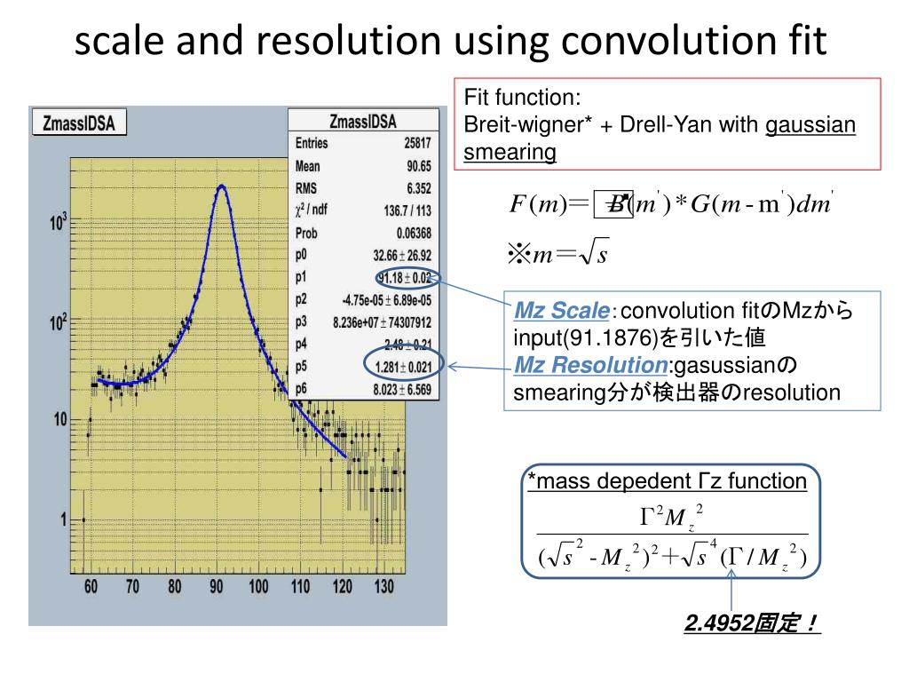 scale and resolutionusing convolution fit Fit function: Breit-wigner* + Drell-Yan with gaussian smearing Mz Scale:convolution fitのMzからinput(91.1876)を引いた値 Mz Resolution:gasussianのsmearing分が検出器のresolution *mass depedent Γz function 2.4952固定!