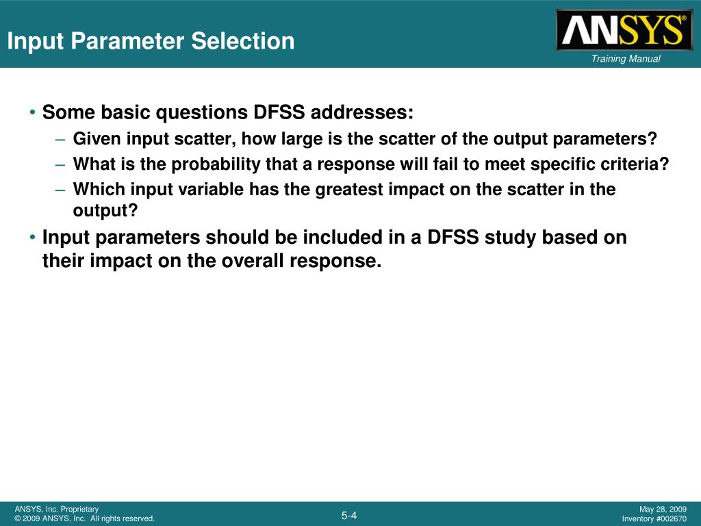Input Parameter Selection • Some basic questions DFSS addresses: • Given input scatter, how large is the scatter of the output parameters? • What is the probability that a response will fail to meet specific criteria? • Which input variable has the greatest impact on the scatter in the output? • Input parameters should be included in a DFSS study based on their impact on the overall response.
