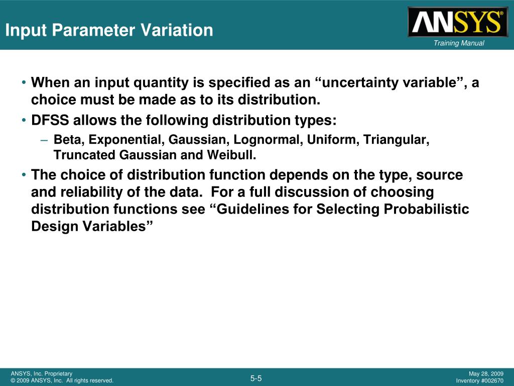Input Parameter Variation • When an input quantity is specified as an “uncertainty variable”, a choice must be made as to its distribution. • DFSS allows the following distribution types: • Beta, Exponential, Gaussian, Lognormal, Uniform, Triangular, Truncated Gaussian and Weibull. • The choice of distribution function depends on the type, source and reliability of the data. For a full discussion of choosing distribution functions see “Guidelines for Selecting Probabilistic Design Variables”